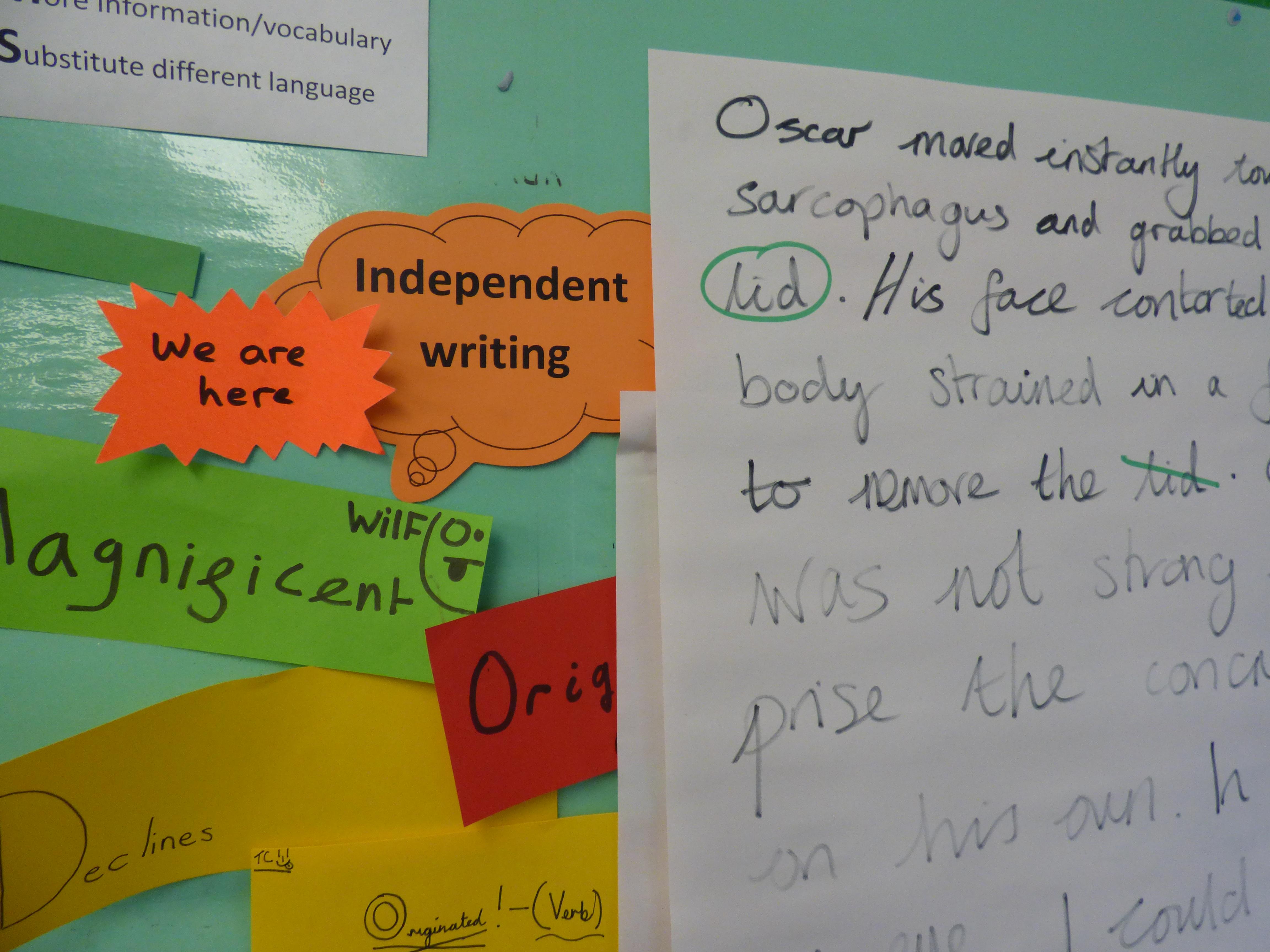 A combination of approaches to developing writing are employed and include modelled, shared, guided/group and independent sessions.